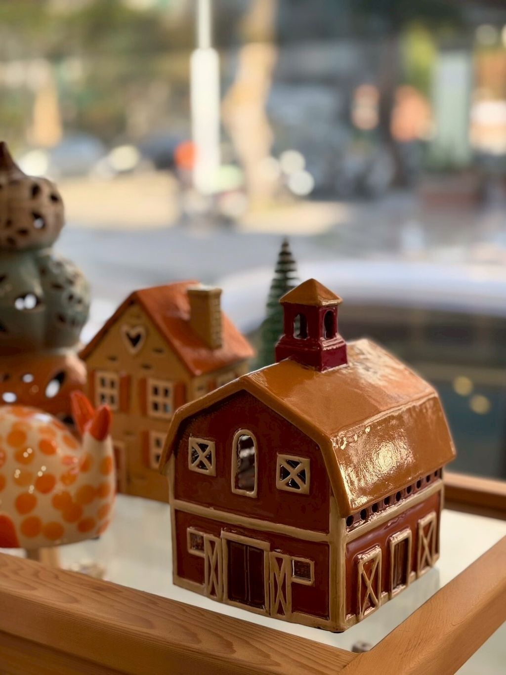 每款陶瓷房屋造型皆附贈電子蠟燭,夜晚點亮後彷彿一座微型溫暖小屋。