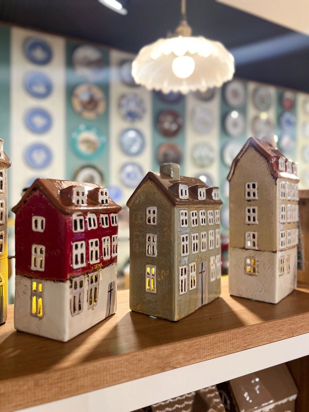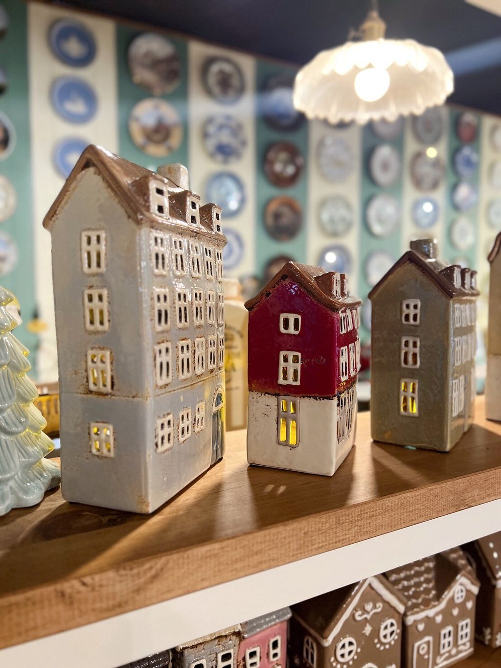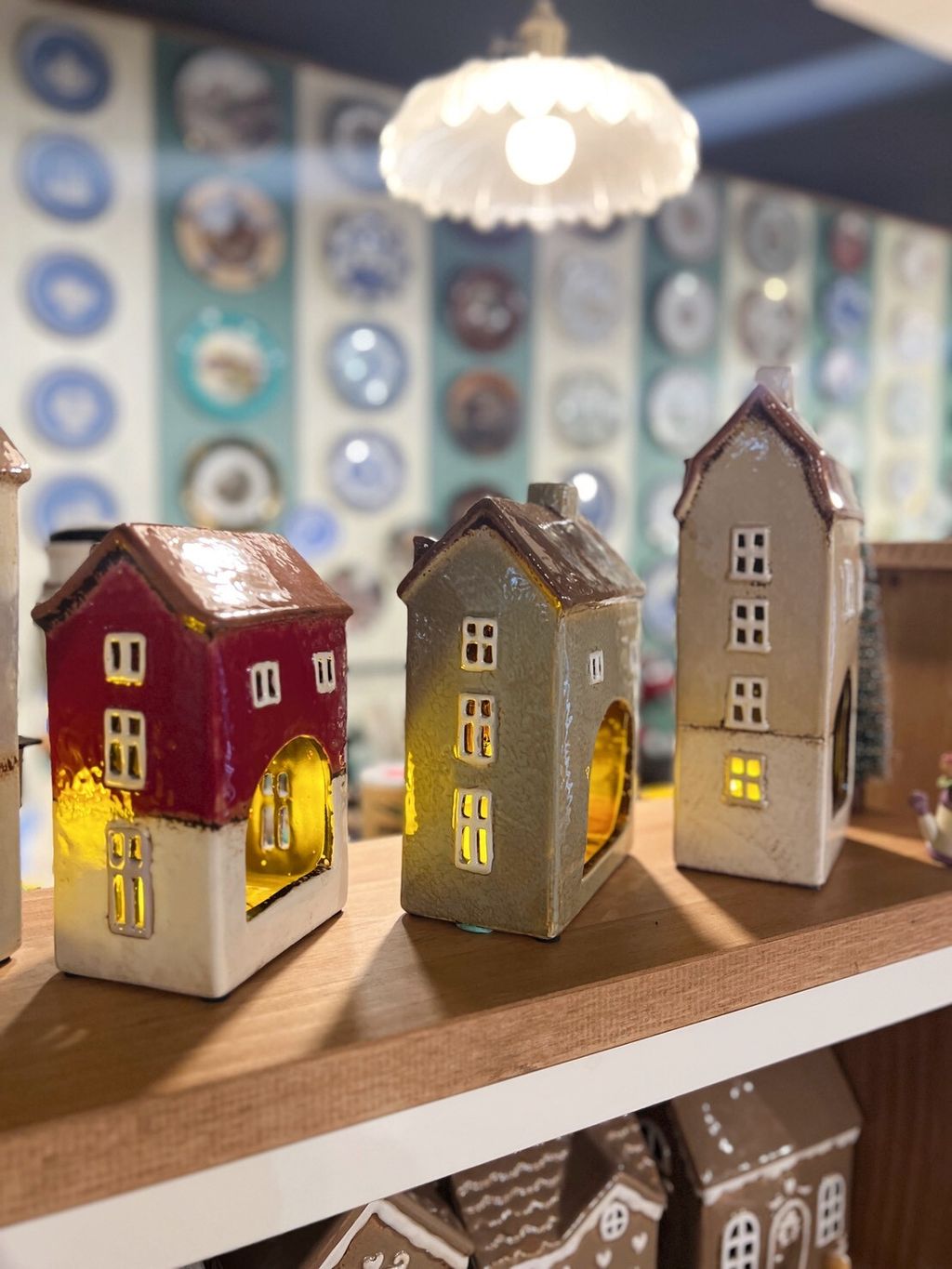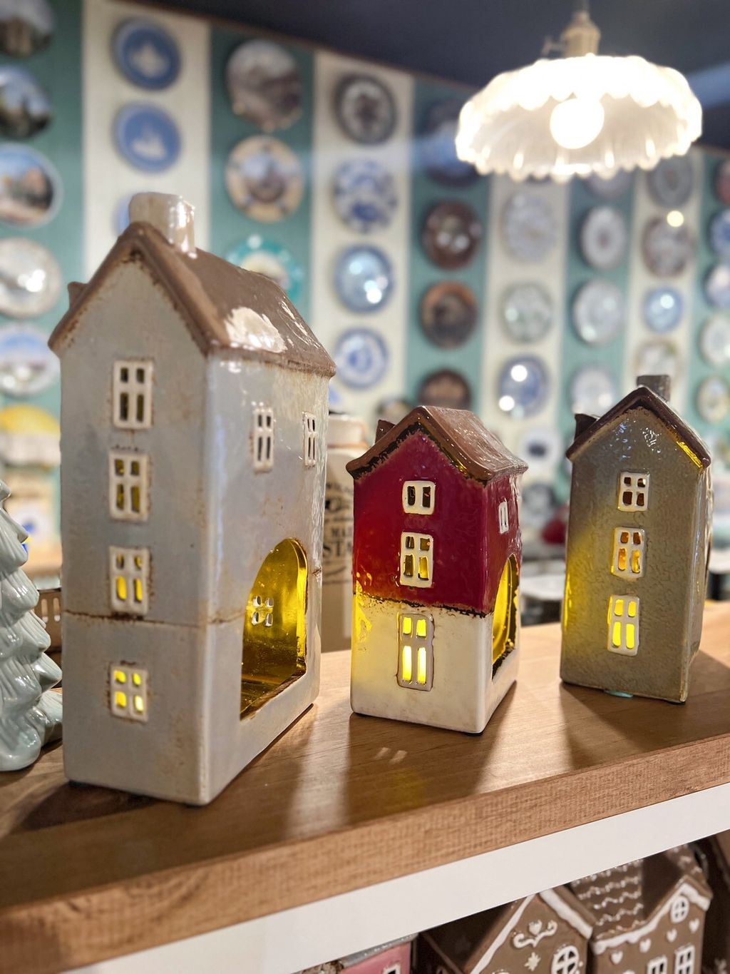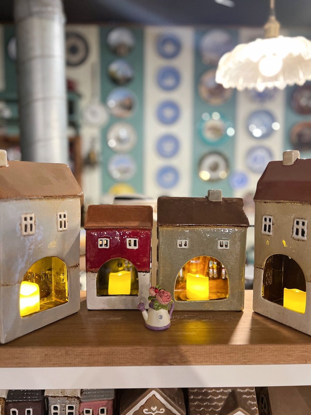 每款陶瓷房屋造型皆附贈電子蠟燭,夜晚點亮後彷彿一座微型溫暖小屋。