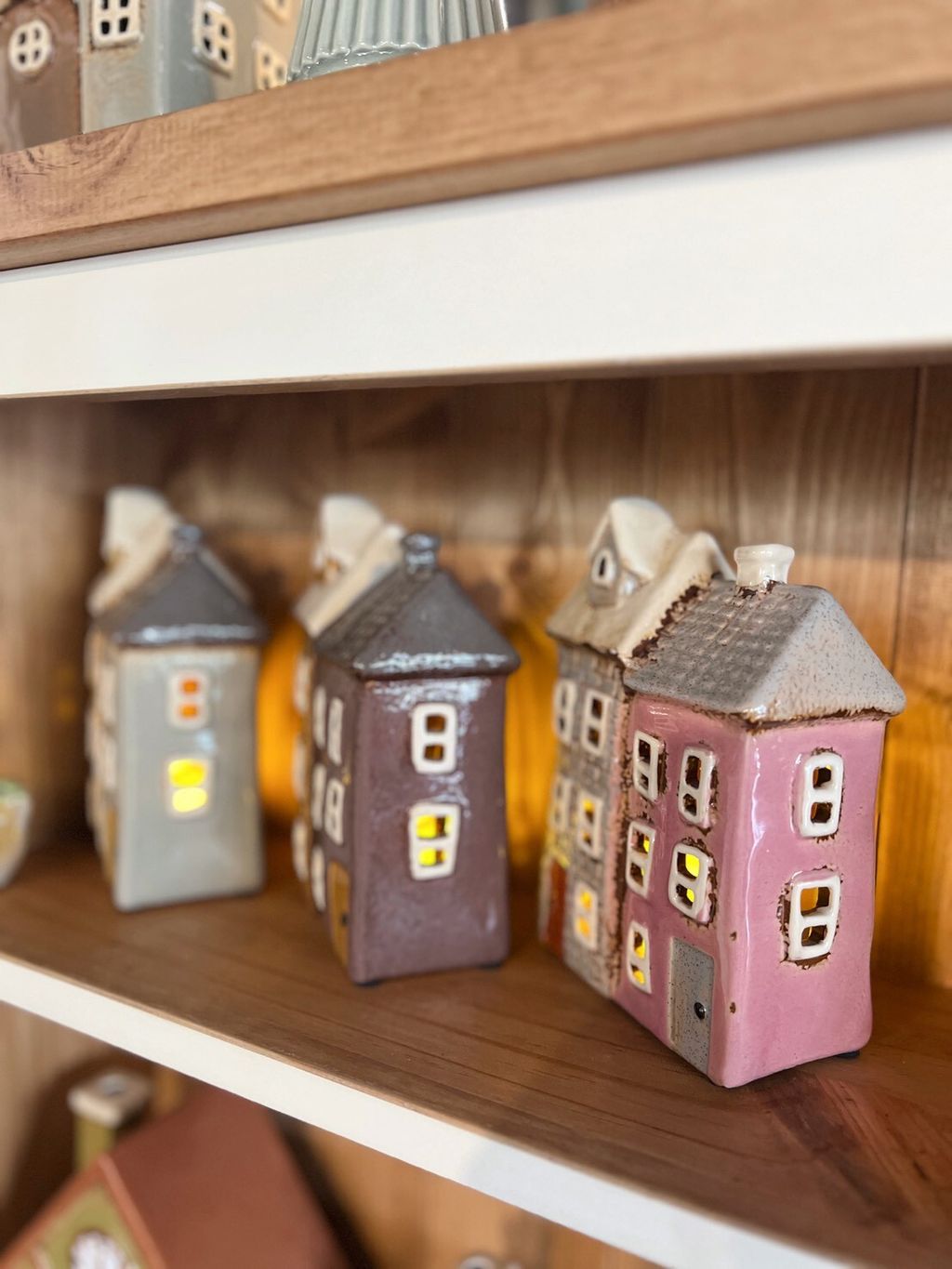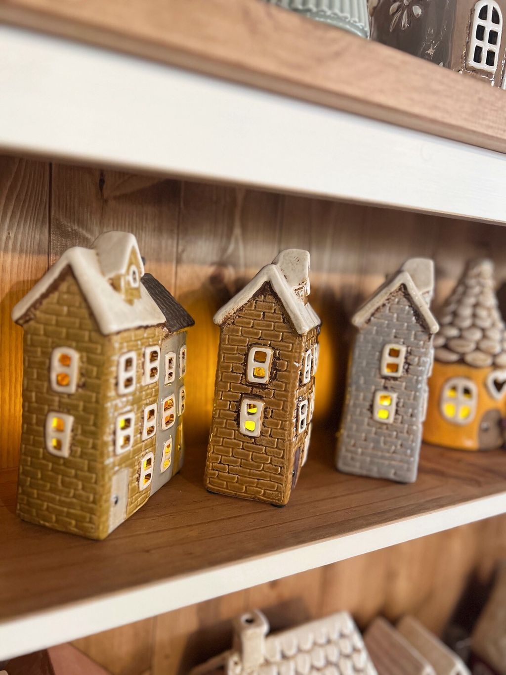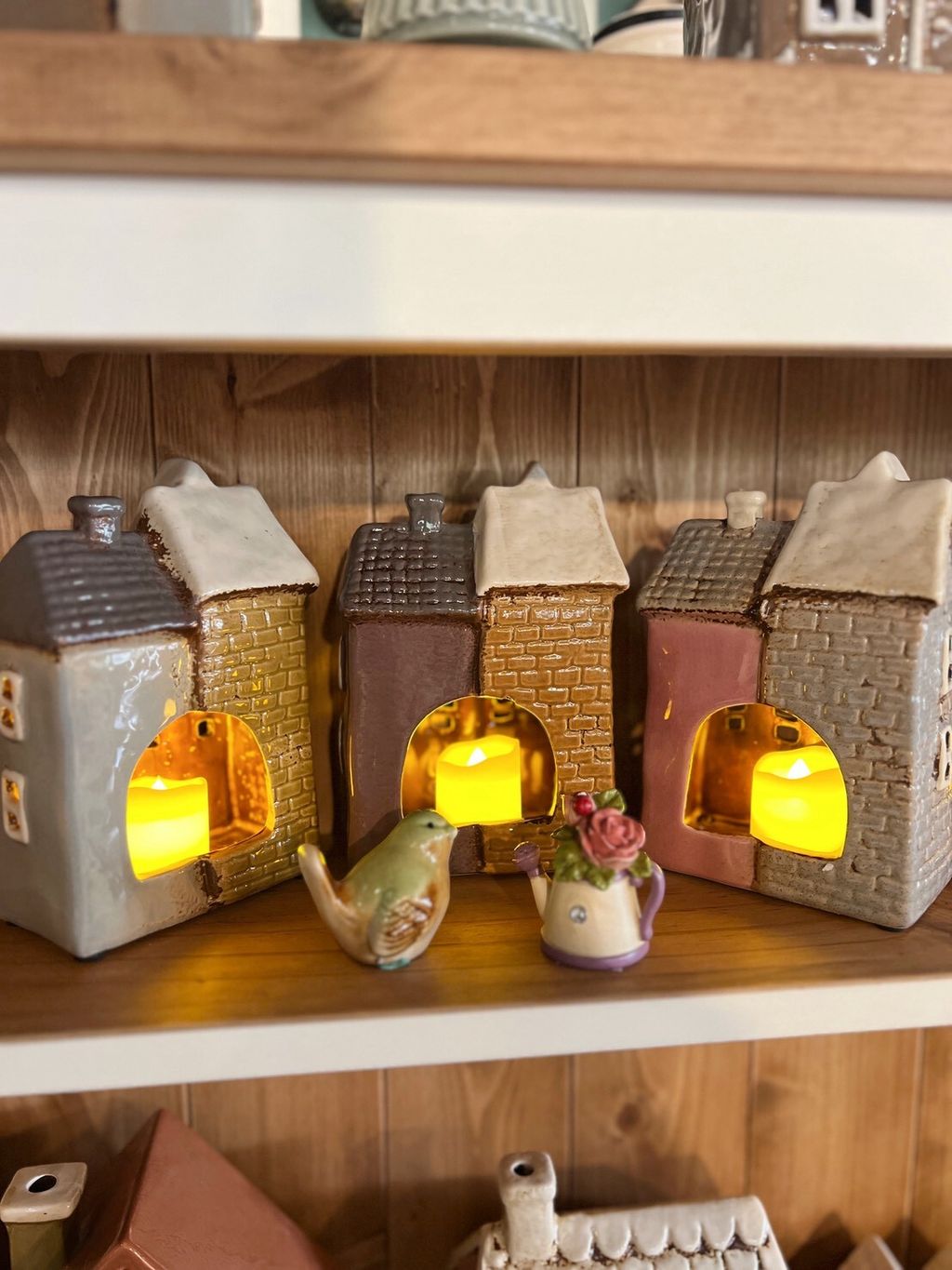 每款陶瓷房屋造型皆附贈電子蠟燭,夜晚點亮後彷彿一座微型溫暖小屋。