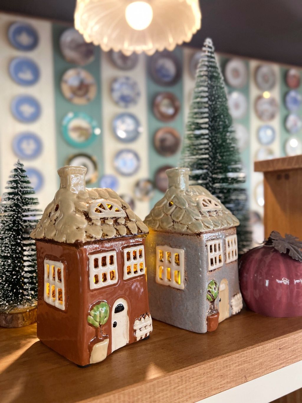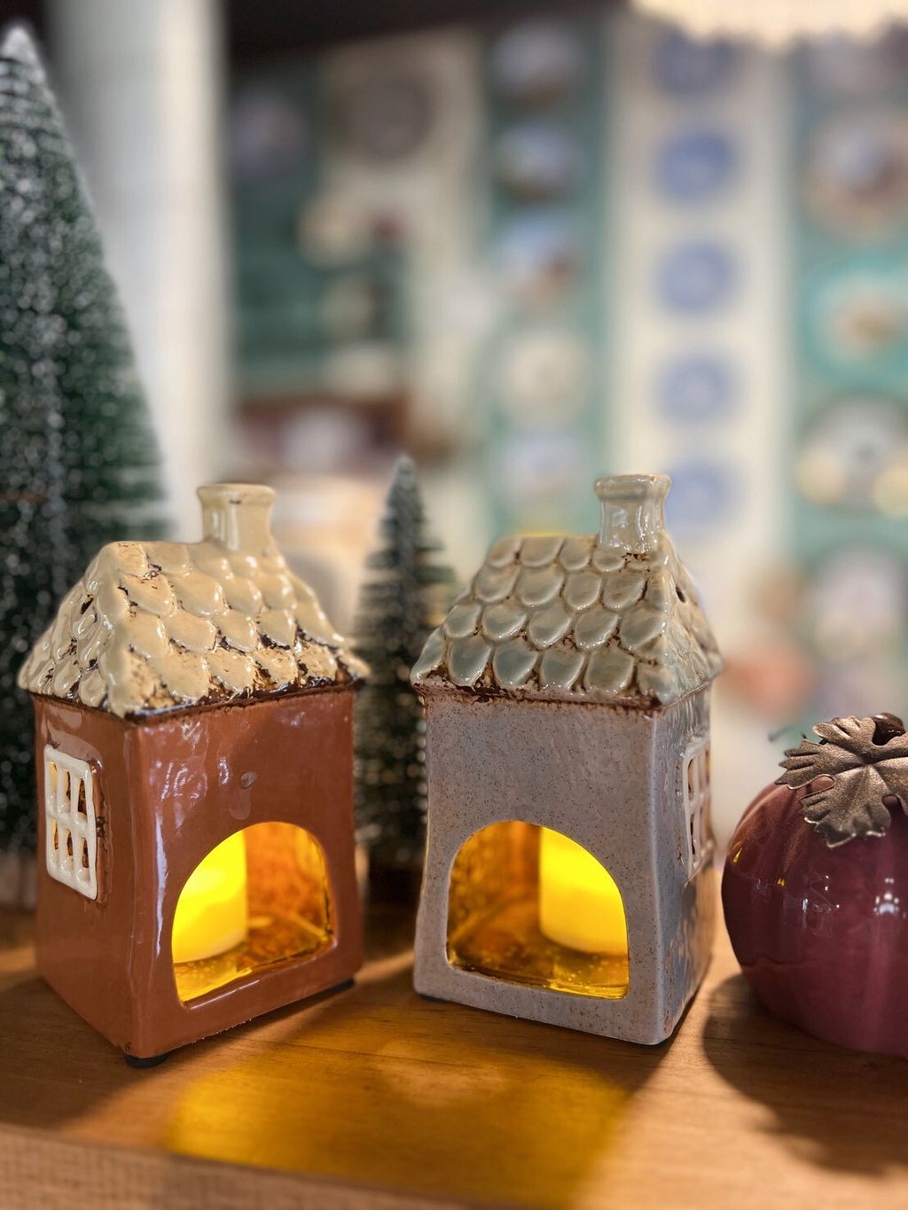 每款陶瓷房屋造型皆附贈電子蠟燭,夜晚點亮後彷彿一座微型溫暖小屋。