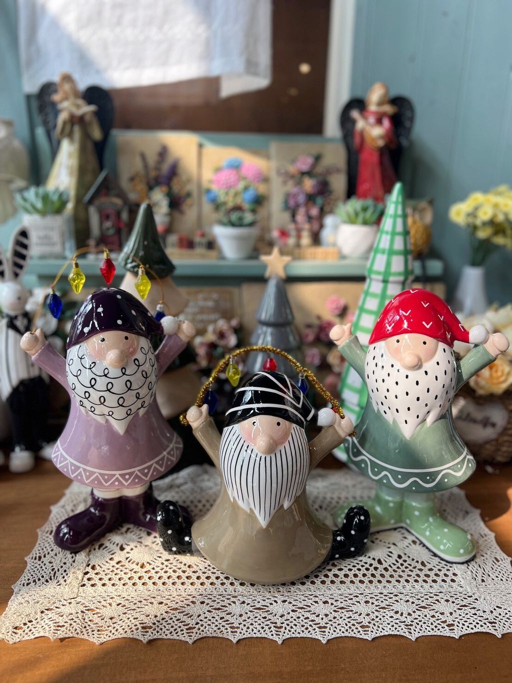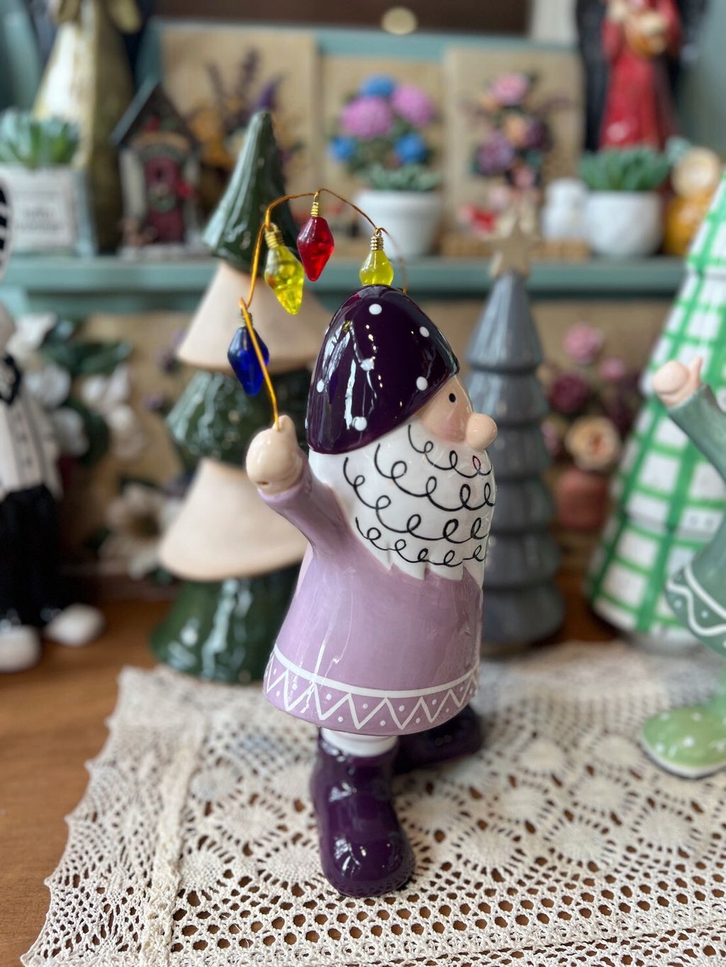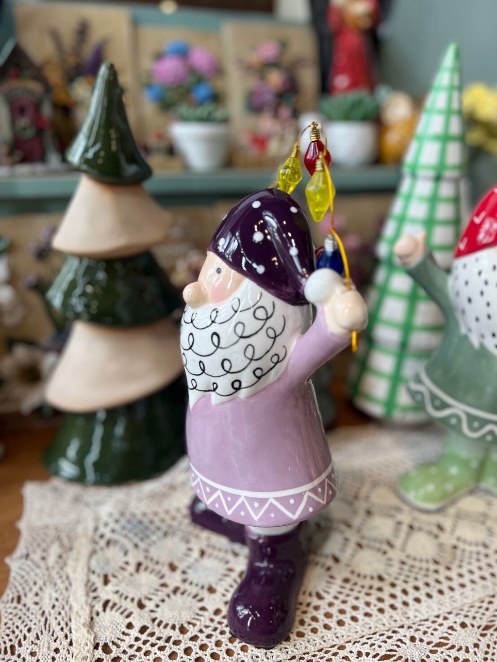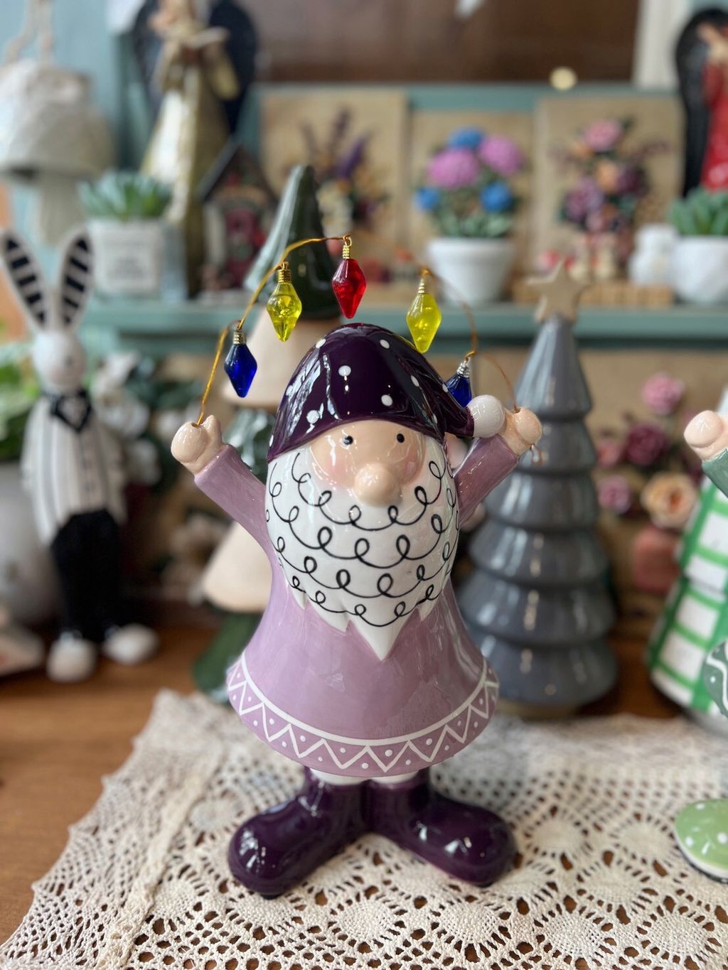 紫衣老公公/卡其衣老公公/綠衣老公公/黃條紋兔/灰圍巾麋鹿/綠蛋兔/粗陶深綠聖誕樹