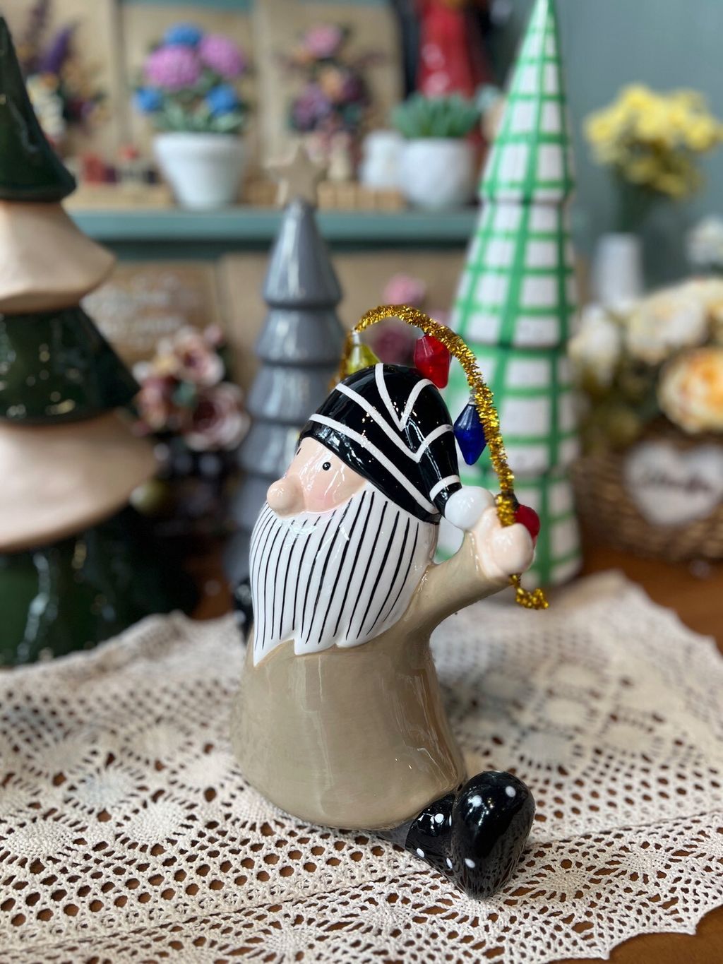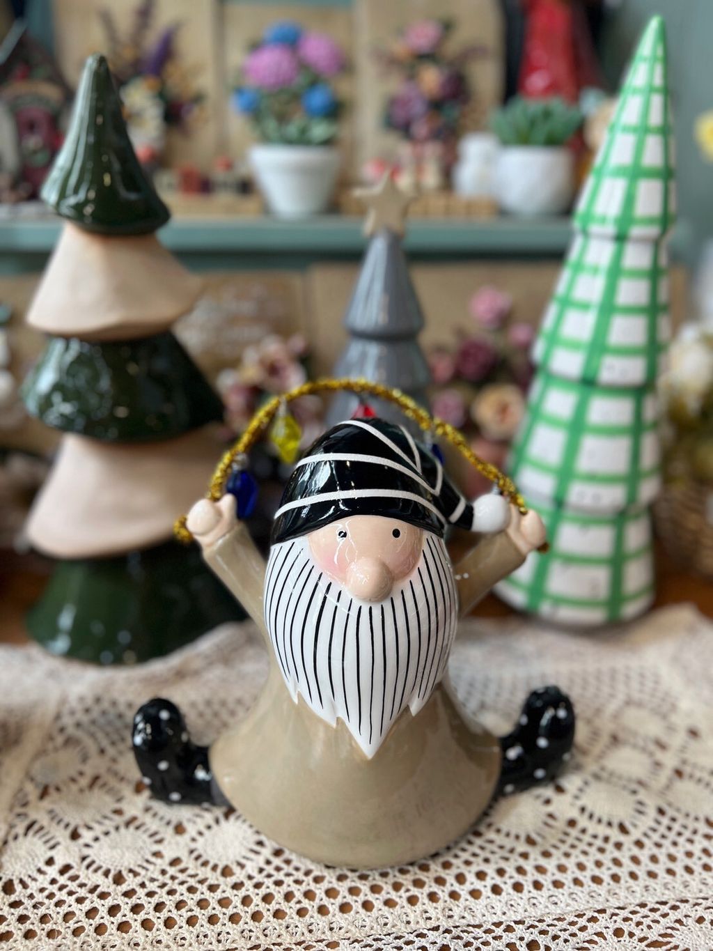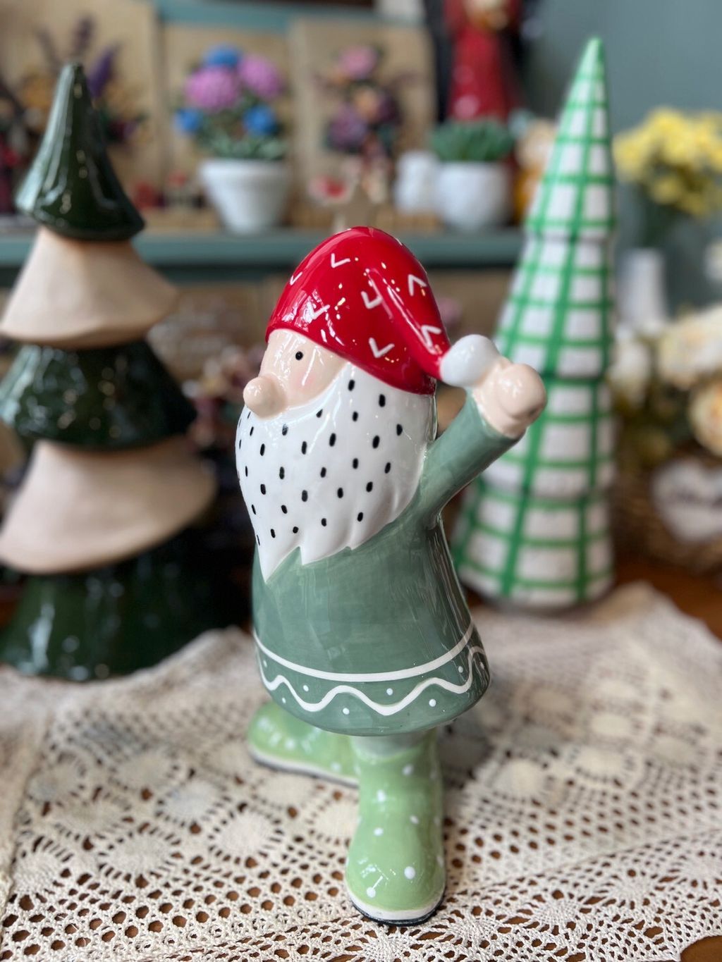 紫衣老公公/卡其衣老公公/綠衣老公公/黃條紋兔/灰圍巾麋鹿/綠蛋兔/粗陶深綠聖誕樹