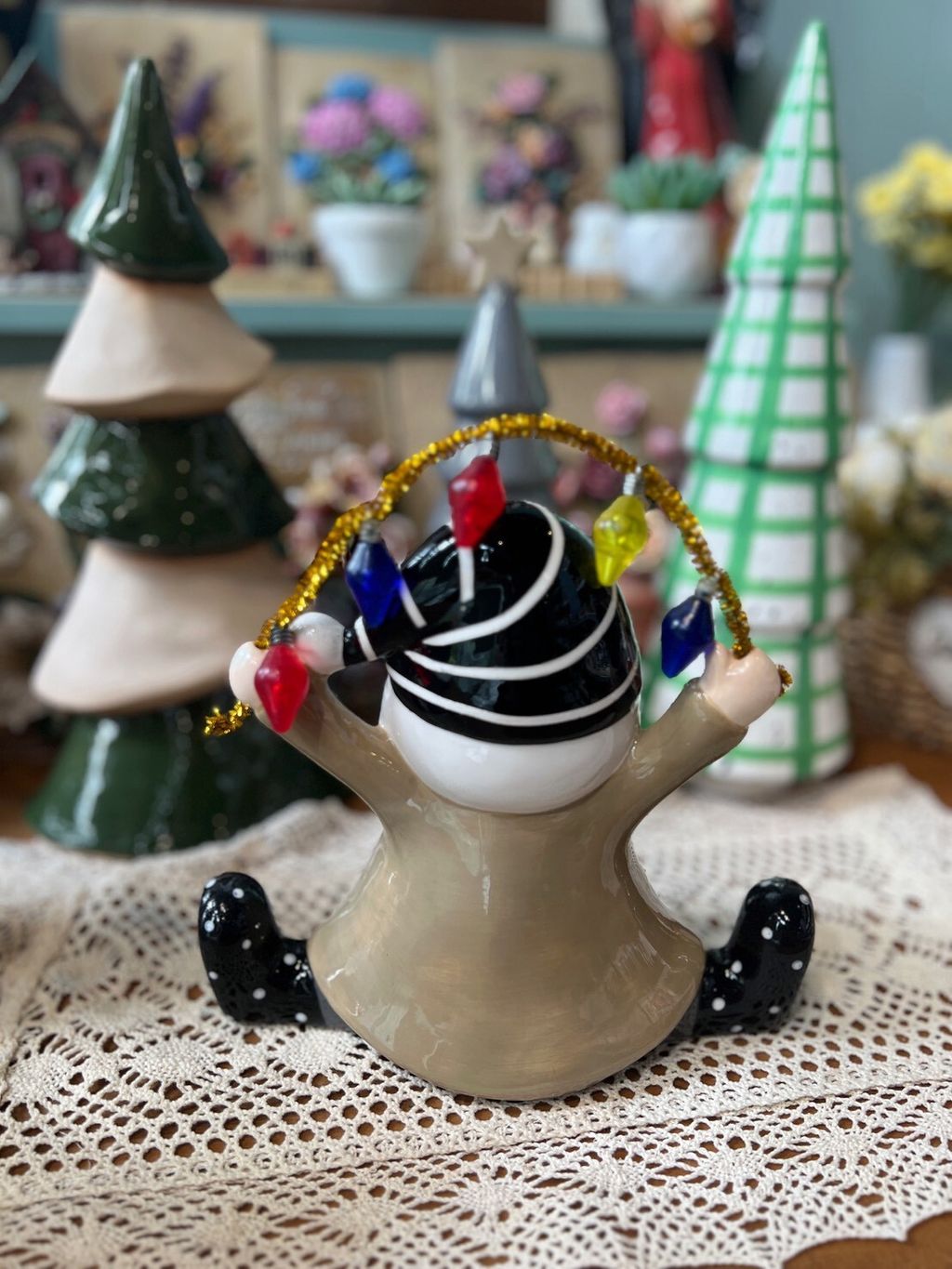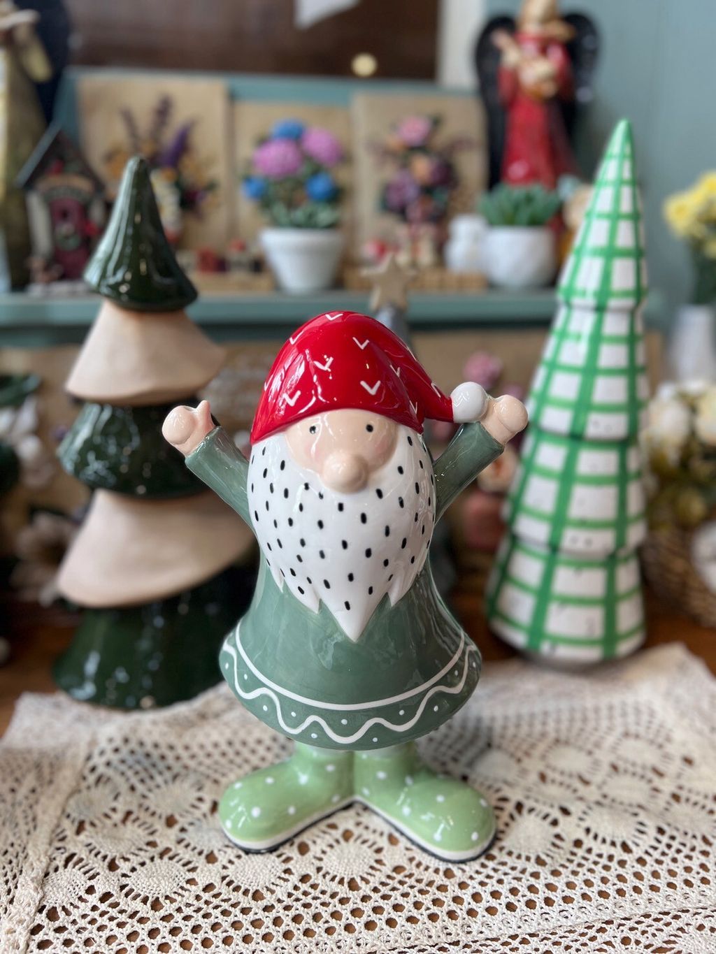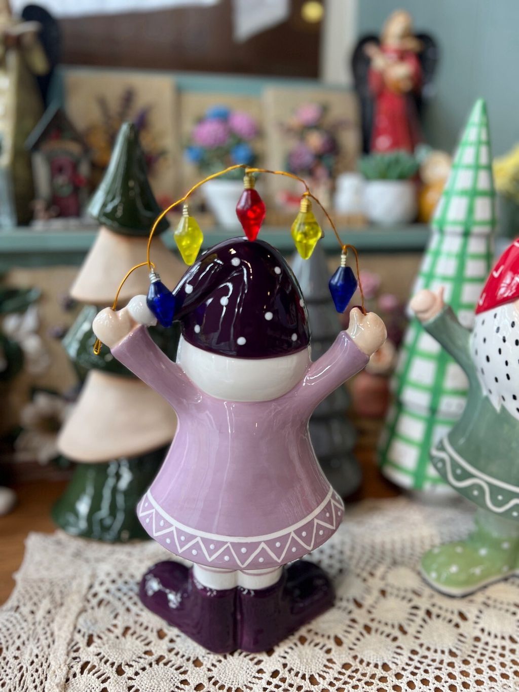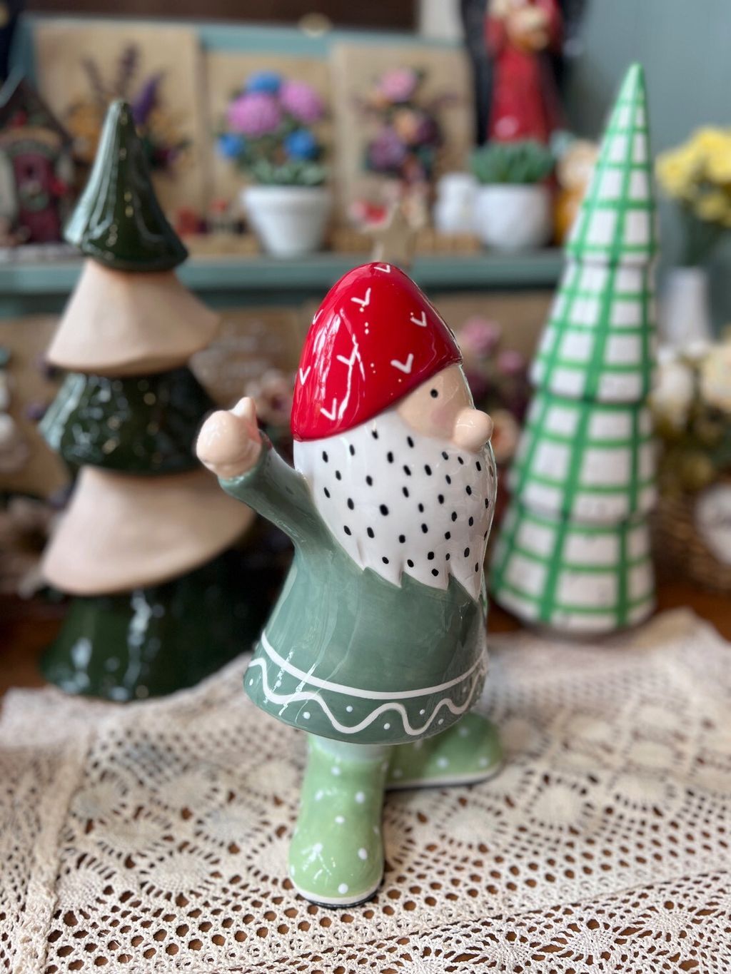 紫衣老公公/卡其衣老公公/綠衣老公公/黃條紋兔/灰圍巾麋鹿/綠蛋兔/粗陶深綠聖誕樹